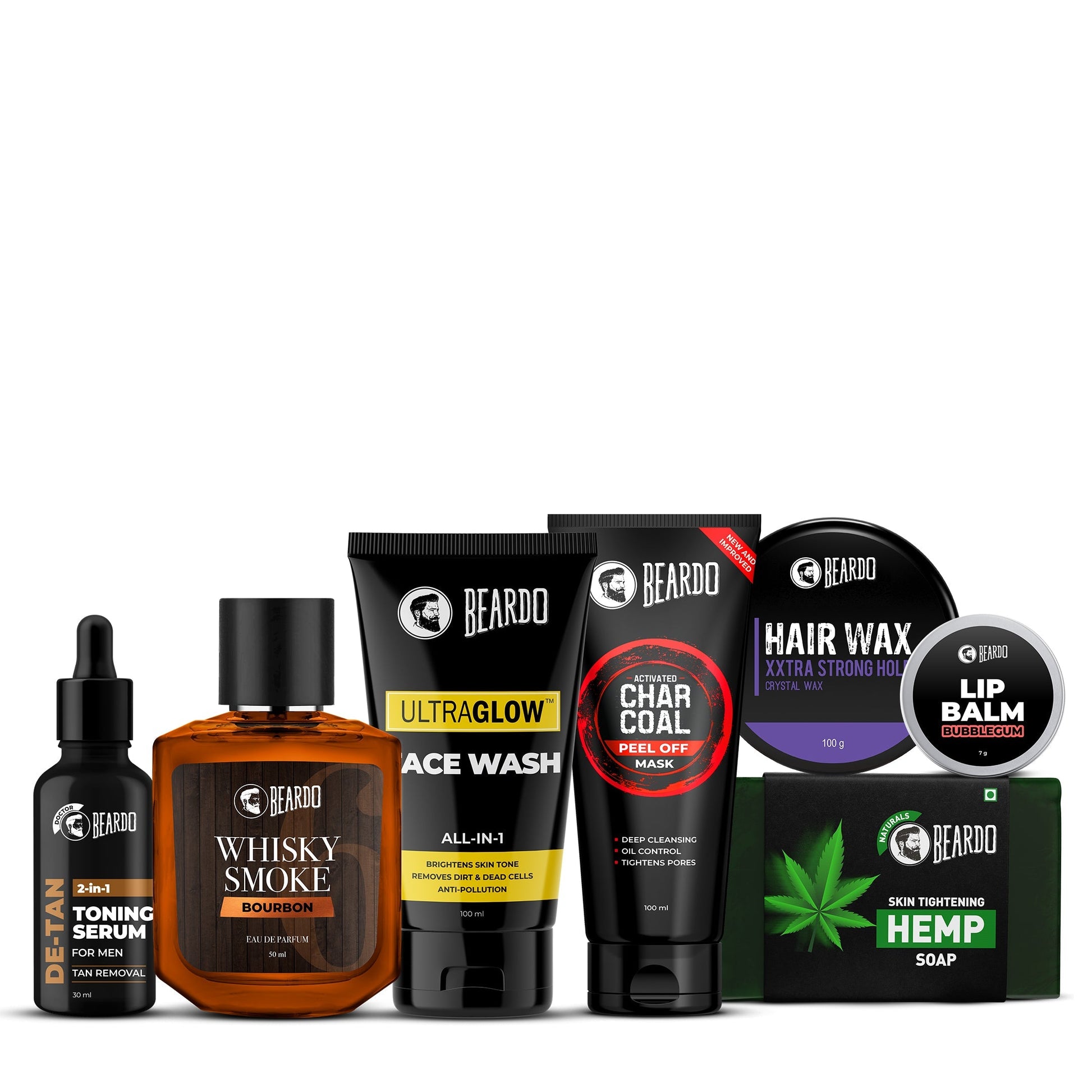 Includes: HEMP Soap (125g), Activated Charcoal Peel Off Mask (100g), Ultraglow Facewash for Men (100ml), Beardo Lip Balm (Bubblegum) (7g), Beardo De-Tan 2 in 1 Toning Serum (30ml), Whisky Smoke Bourbon Perfume EDP (50ml), & Hair Wax XXTRA STRONGHOLD Crystal Wax (100g)