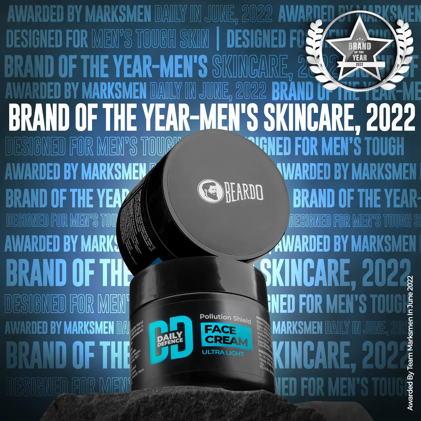 Beardo's revolutionary new Daily Defense Cream is especially made to suit men's rugged lifestyle and oily skin. The intense formulation with ingredients like antioxidant rich Vitamin E and oil balancing Niacinamide are known to bolster your skin's quality against free radicals while building an indestructible shield against UV exposure and environmental toxins. All of this while feeling invisible and non-sticky on your skin.