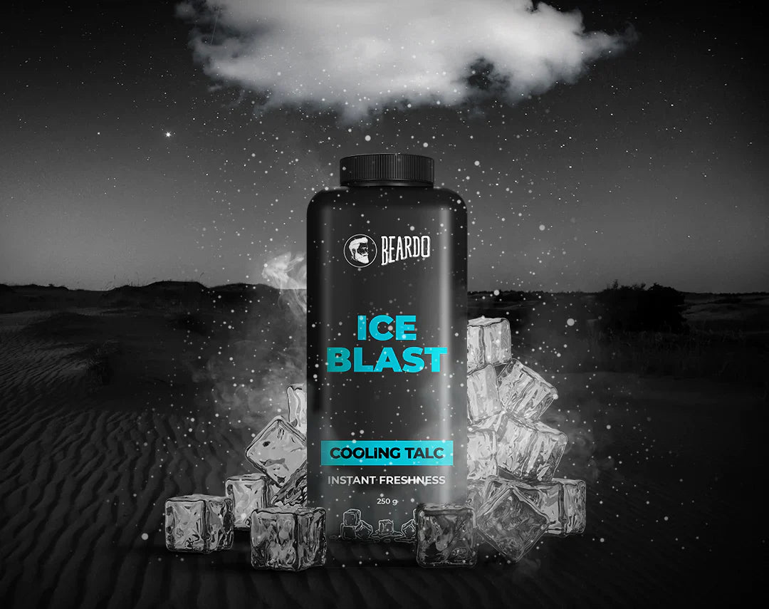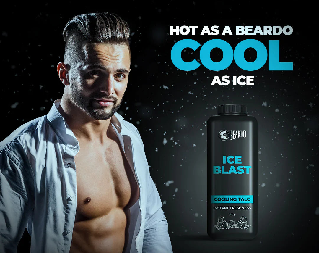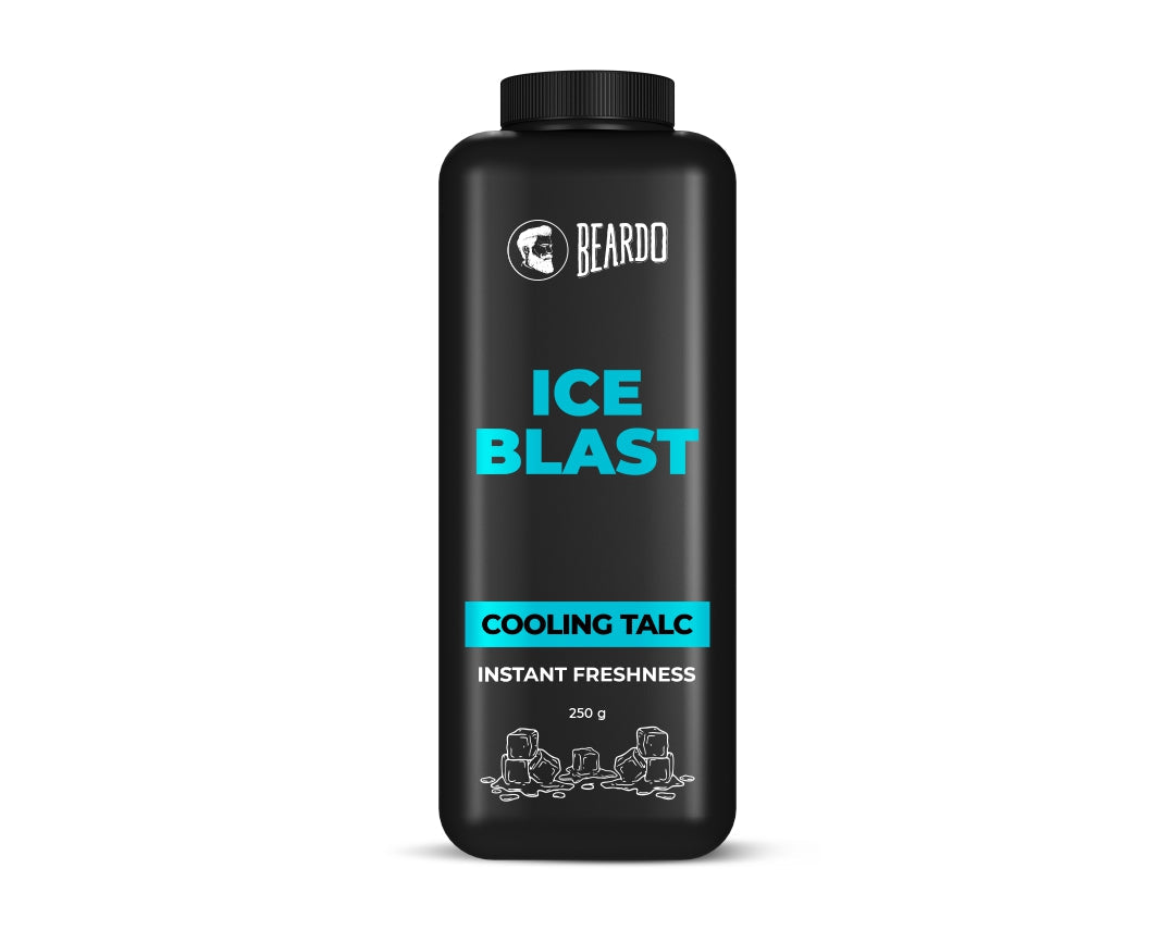 Beardos get cooler as the weather gets hotter. With the new ICE BLAST Range- feel a jolt of coolness on your skin. This talcum powder is armed with the MAX FRESH of menthol which is designed to protect your skin from the heat, control sweat production, prevent body odor, and give you long-lasting freshness. Look out, we see a cool wave in your future!