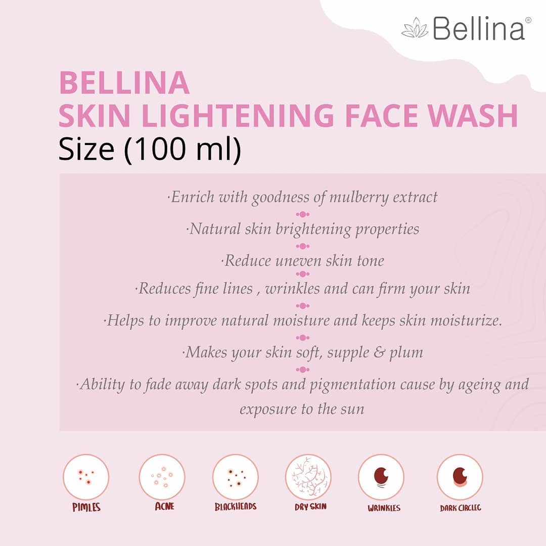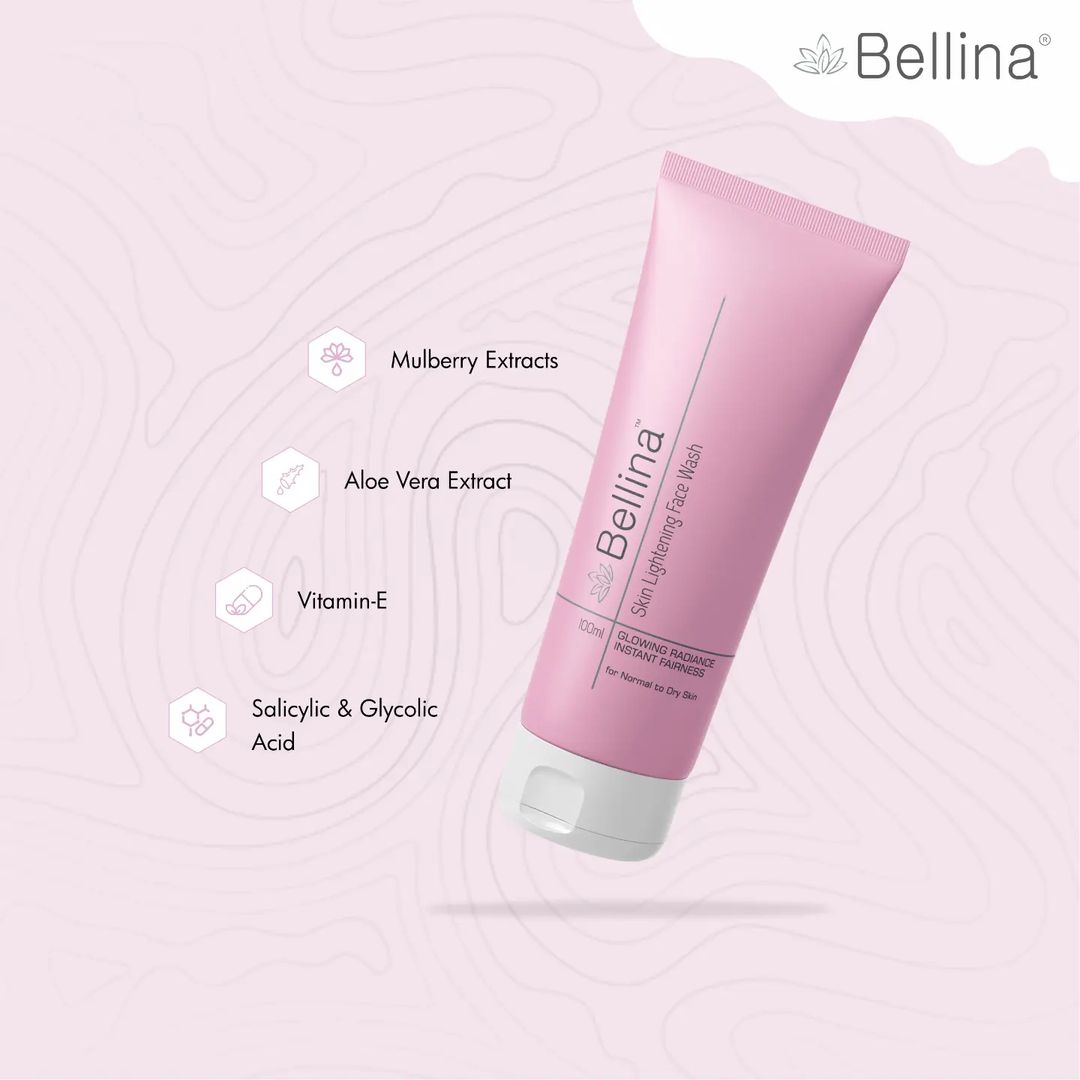 BELLINA SKINLIGHTENING FACE WASH is uniquely design for normal to dry skin which removes unwanted tanning & reduces pigmentation. This face wash is enriched with goodness of Mulberry, Aloevera and Vitamin E. It gently exfoliates dead skin & imparts freshness and glowing radiance. Infused with complex vitamins & powered by continuous release technology, it concentrates on giving you a visibly radiant skin through the day.