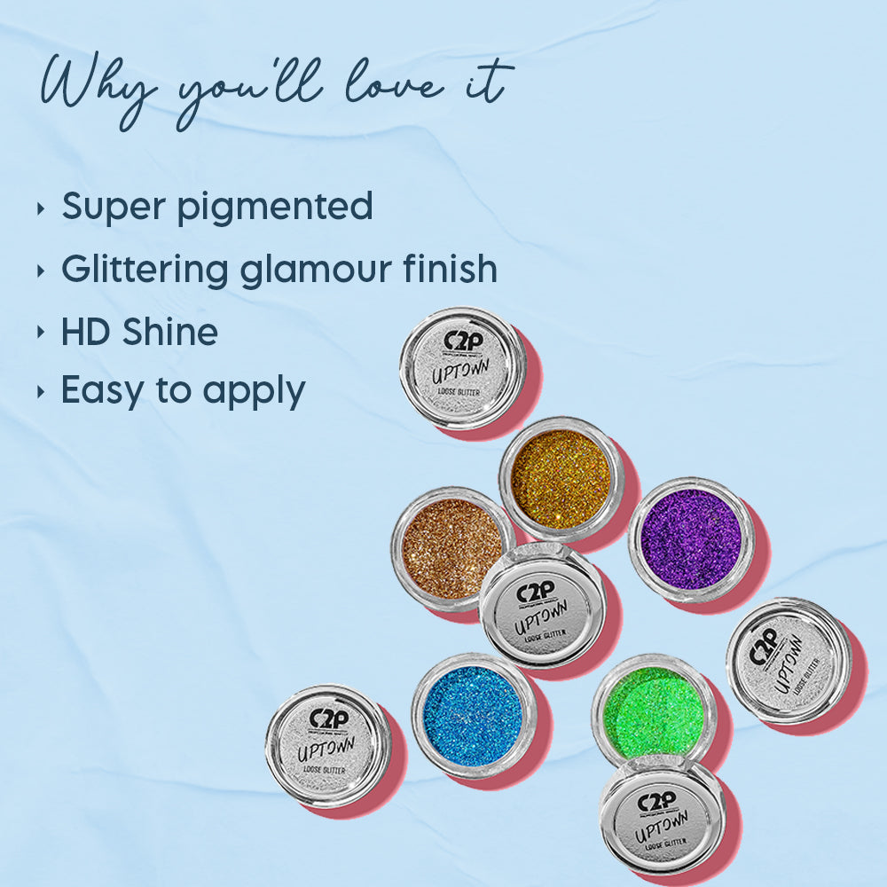 Don’t be afraid to sparkle! Shine on like the diva you are with the HD loose GLitters from C2P Pro. Make your eyes shine and your makeup pop with glamour, with loose sparkling eyeshadows that instantly add shine and depth to the eyes. These highly concentrated fine shimmer particles settle in place with the help of Glitter Glue to create a high definition shimmery metallic effect that could put the stars to shame!