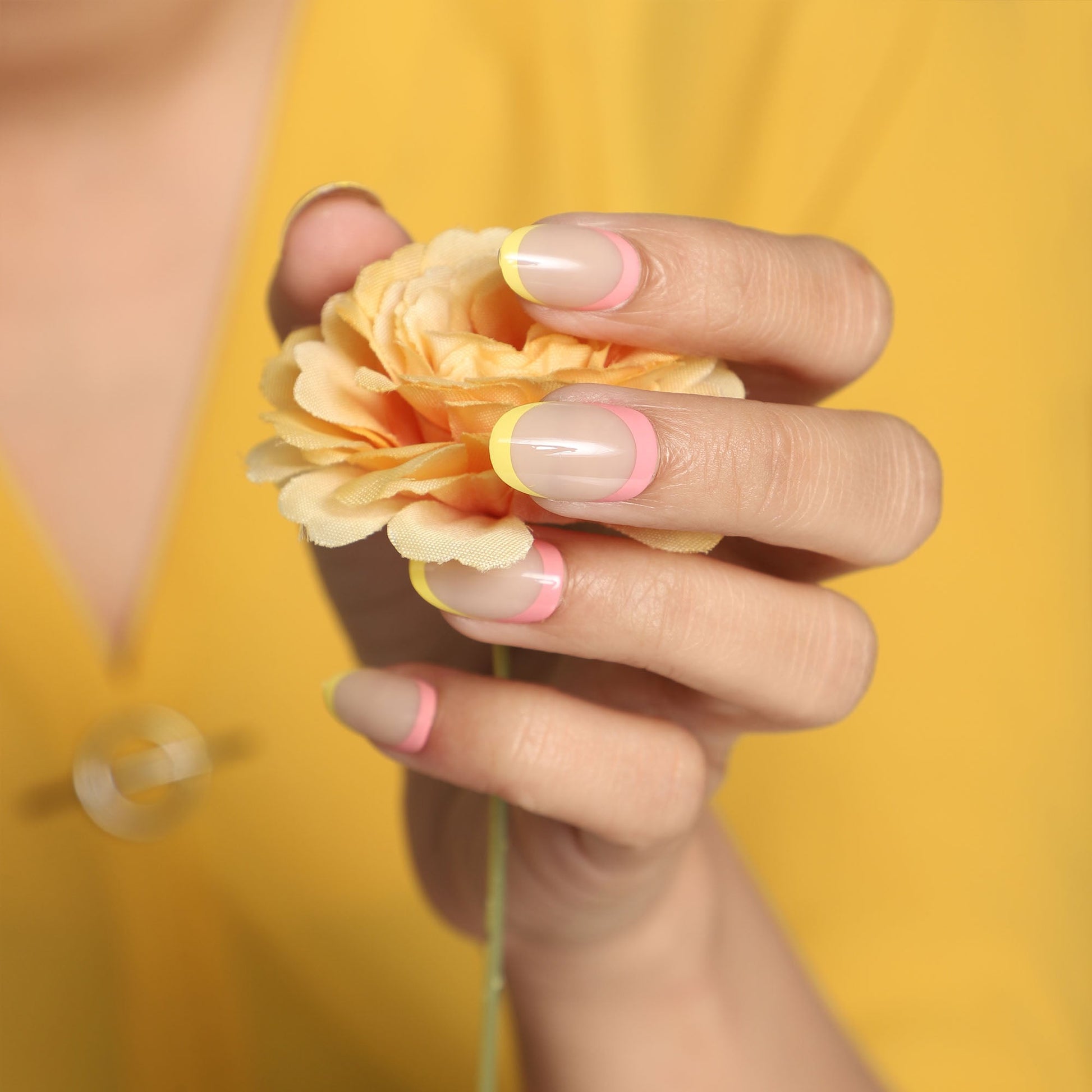 These glossy nude nails are on everyone’s wish list, and it’s no wonder why. After all, who doesn’t love a 24-pcs nude oval-shaped press-on nail set with pastel pink french tips and hints of yellow nails? Nude press-on nails are effortlessly chic, and this timeless nail set includes pink and yellow accent nails that are totally luxurious.