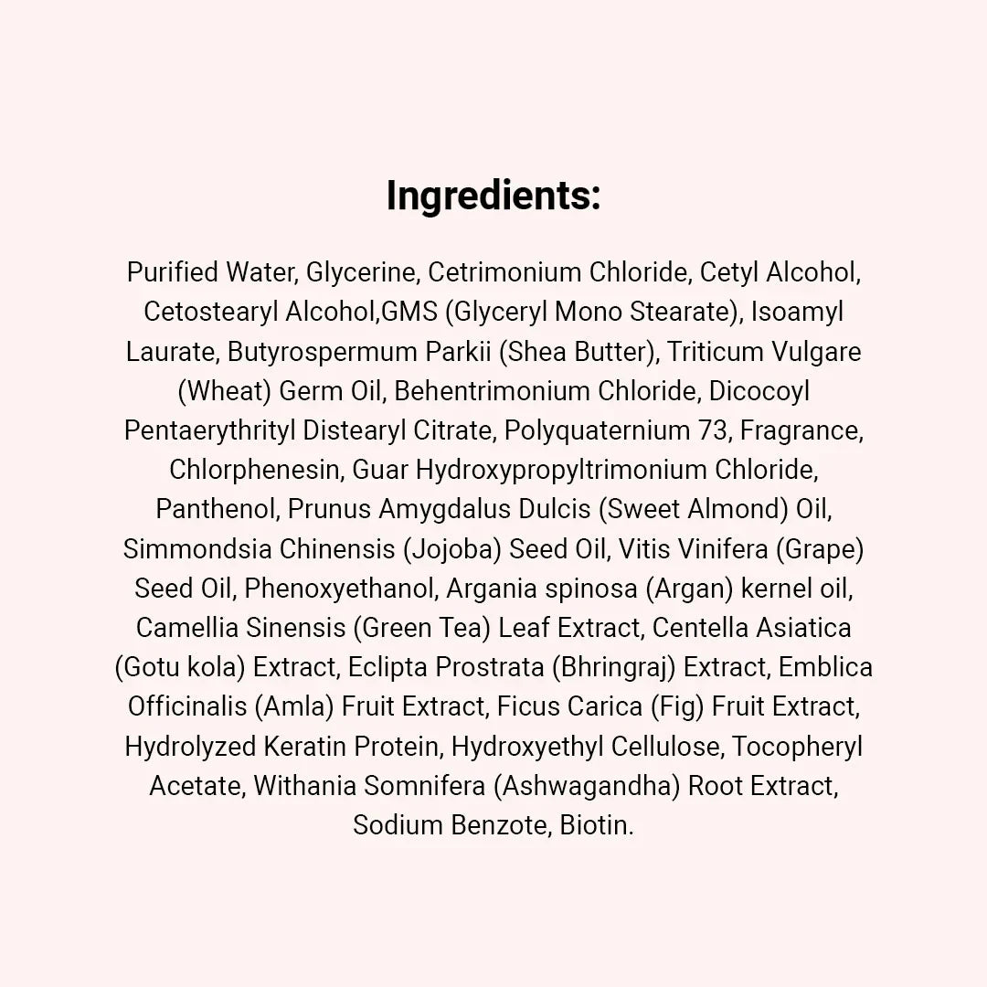 A gentle hair conditioner enriched with actives that deeply nourish the hair, including fig extract - to nourish and moisturise hair without weighing it down while making it shinier, shea butter - to reduce coarseness, dryness and/or frizziness, wheat germ oil - to repair hair damage and prevent hair loss, sweet almond oil - to reduce split ends, jojoba seed oil - to strengthen hair and add volume, grape seed and argan oil - to add moisture and give protection from daily damage, gotu kola and green tea leaf extract - to accelerate hair growth and strengthen it, bhringraj, amla and ashwagandha - to reverse premature greying while making hair stronger by promoting hair growth.